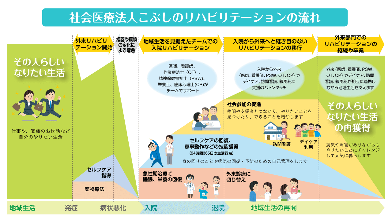 退院後は定期的に通院して病気や症状をコントロールし、なりたい生活に近づけるよう地域スタッフが仕事や生活上の困りごとの相談にのり自分でできることを増やしていきます。